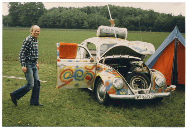 Mein erstes Auto erstand ich im Jahr 1971. Es war ein weißer VW-Käfer. Die Farbe war mir zunächst egal, da er gebraucht war und ich nach jahrelangem Motorradfahren endlich im Trockenen sitzen wollte. Mit der Zeit langweilte mich die weiße »Farbe«. Kurzerhand kaufte ich mir ein paar farbige Sprühdosen und »verschönerte« das Gefährt, vielleicht nicht besonders künstlerisch aber bunt. Man erinnere sich, es war gerade die Hippie-Ära zu Ende.